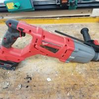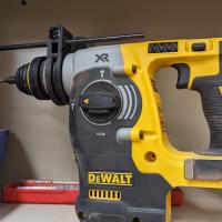 The Rotary Hammer Drill is used to drill into stone, concrete, and brick. It uses SDS-Plus bits (located in the container next to the drill), which have a carbide tip. This tip is very hard, not sharp, and the hammering of the drill crushes the concrete. The bits are loaded and unoaded by pulling the collar on the tip of the drill back. On the side of the drill there is a knob that can select Hammer+Drill mode, Hammer mode that can rotate freely, Hammer mode without rotation, and Drill Mode. Hammer+Drill is the most commonly used mode, and Hammer only mode would be used with a chisel attachement for breaking rock or scraping.