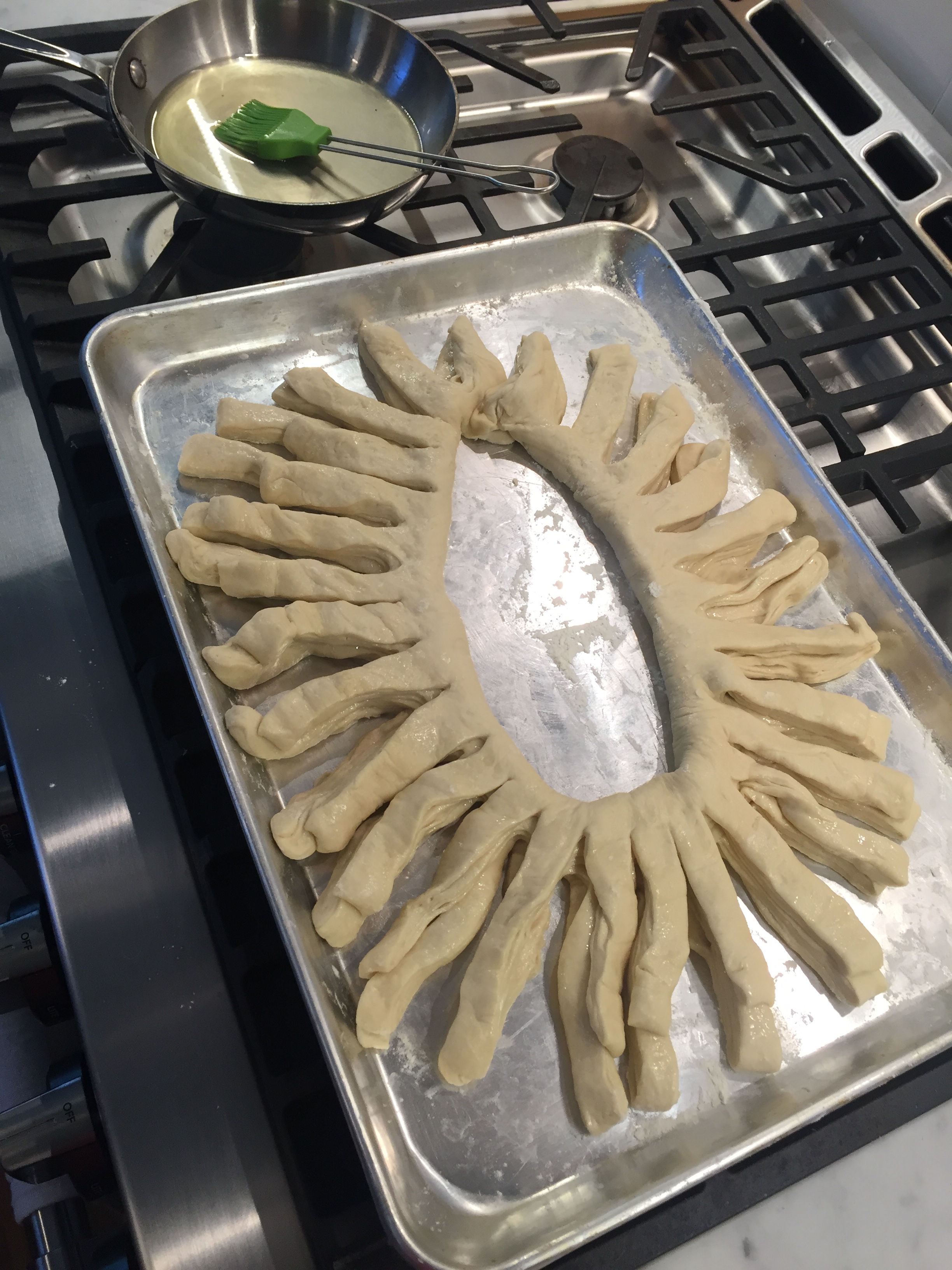 Start to finish, the entire process takes about 4 hours. The dough is pretty straight forward (4C flour, a TBSP salt, a TBSP of olive oil, and water with a pack of active dry yeast dissolved into it). A Kitchenaid on slow does the kneading for you for about 5 minutes and then you rest the dough for an hour. Then it gets fun. You roll it to 8"x24" , coat most of it with melted lard, fold the short ends into the middle and then fold it in half again. I like to pinch the seams to close it up. The weather was a bit warm, so I saran wrapped the dough and let the fat set up a bit in the freezer for 15 minutes. Then I repeated that process again. Then I rolled it into an 8" wide ribbon about 1/4" thick and gave it a coat of lard, but instead of folding it the previous way, I folded it in half along its long axis. Then you slice 1" chunks of it, leaving a spine like a book binding, and form it into a circle. After another 30-60 minutes of rest/rise, you can bake it for 30 minutes in a 400 degree over. Voila! Cremona...If you're wondering about the copious amounts of lard, the idea is similar to French puff pastry. Lard is actually an emulsion of fat suspended in water (or vice versa...I forget)...anyway, during baking, the water is released as steam and gives the bread a "puff". Super delish! Enjoy.