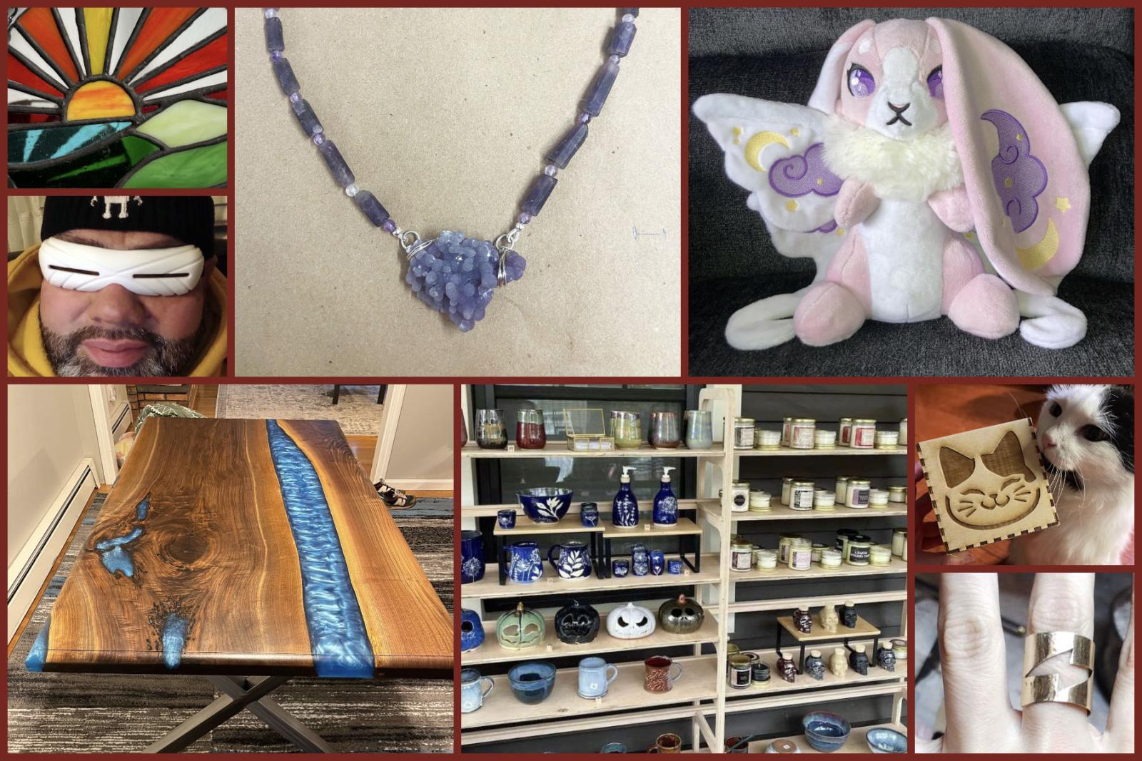 This vibrant collage showcases a variety of handcrafted and artistic items, including jewelry with a purple stone, a plush winged creature, a wooden table with blue resin, and various ceramics and candles displayed on shelves. A stained glass piece, a person wearing a sleep mask, a laser-cut wooden cat, and rings on fingers are also part of this collection.