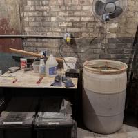 This area is used to remove rust and paint from metal objects. In addition to an electrocleaning tank there is a vinegar and lye bath.