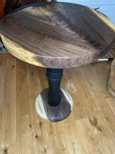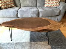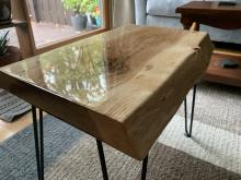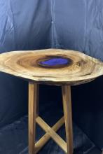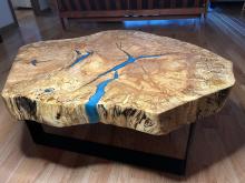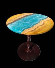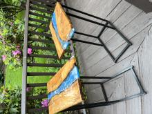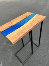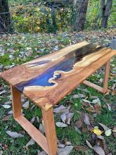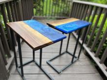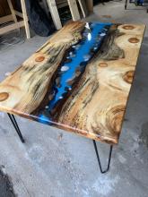 Handcrafted tables can be customized by dimensions, wood used, resin usage/color, and leg style/color.