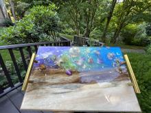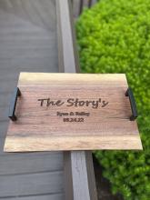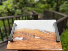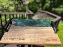 Handcrafted charcuterie boards that are highly customizable with the wood type, resin usage/color, size, handle design and engraving! All of our charcuterie boards are finished with a food-safe durable finish!