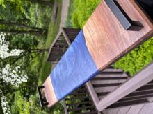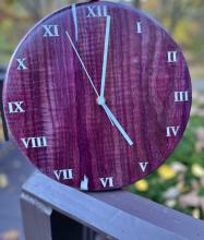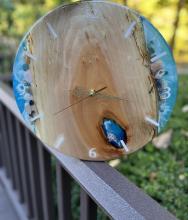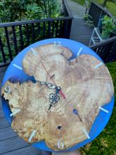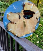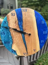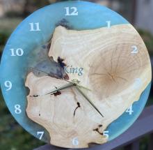 Handcrafted wood and resin clocks. Customization on clock size, wood type, resin usage/color, and engraving are all available!
