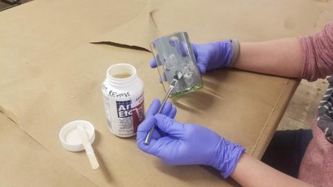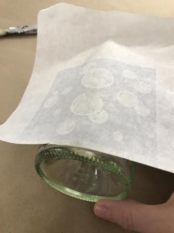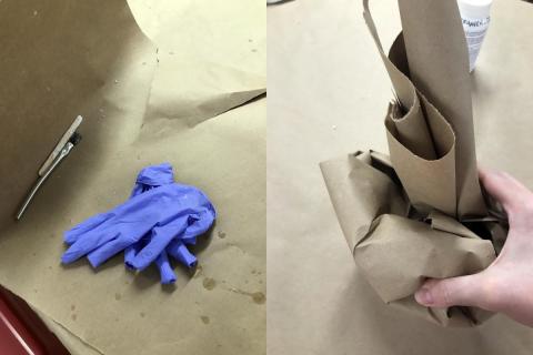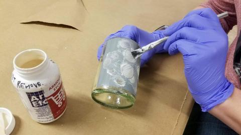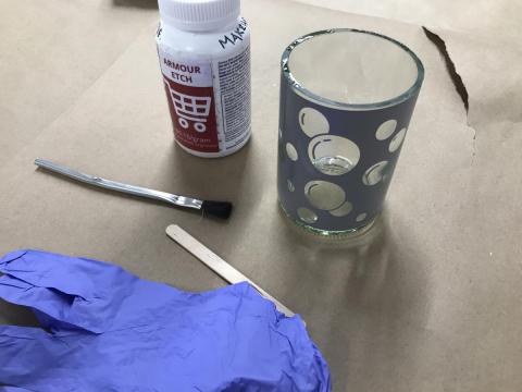 With your gloves STILL on: set your glass down to dry. Cap the Armour Etch and return it to the drawer. Take off your gloves carefully (inside out) and leave them on the center of the craft paper with the used brush and craft stick. Wrap up the supplies using the edges of the apper to avoid contact. Trash these used materials.