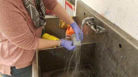 WIth your gloves still on, bring your piece to the slop sink and rinse thoroughly with warm water. (Warm water will just make the vinyl easier to peel off). Don't panic when it looks like there is no etching there. It is hard to see when wet. Just remove all the compound and then remove the vinyl.