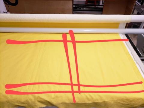 With a fabric marker and straight edge, draw a line 4-6 inches from the top across the fabric. Above this line is where you will stitch to adjust the tension of the threads. Do this now.