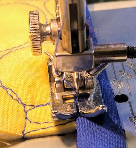 I prefer NOT to precut the bias tape length. Start 2-3 inches from a corner. Place the tape with the wider side on the BOTTOM of the edge. That way when you stitch along the top side, you will catch the bottom side without having to see it. Use your fingers to hold the tape in close to the edge and stitch to the next corner. Finish with the needle down at a 45 degree angle from the point.