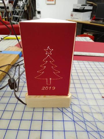 This is a cute desk/bedside lamp with an optional laser engraved shade made using a stippling type pattern. It's extremely inexpensive and fairly quick to fabricate. It makes a great gift, especially due to its interchangeable press-fit shade: you can give the base along with one shade as a gift, and then add to it by gifting new shades for other occasions. Depending on the wood/finish and the bulb brightness you choose, it can also look pretty nice without a shade.